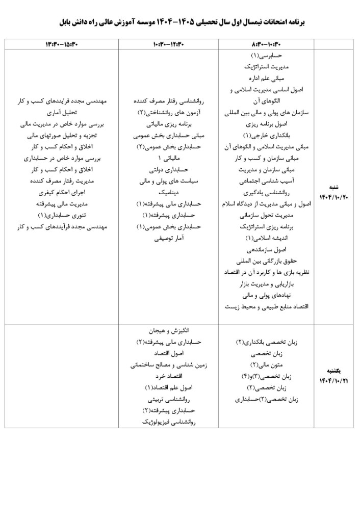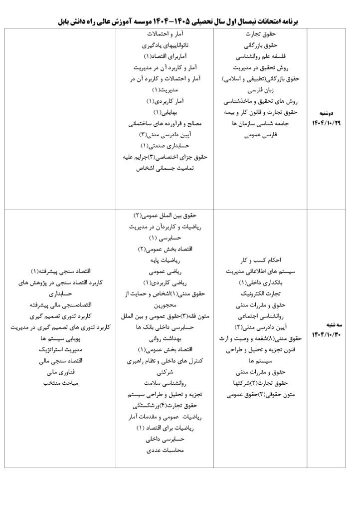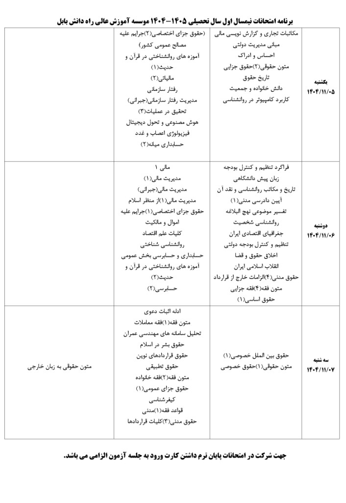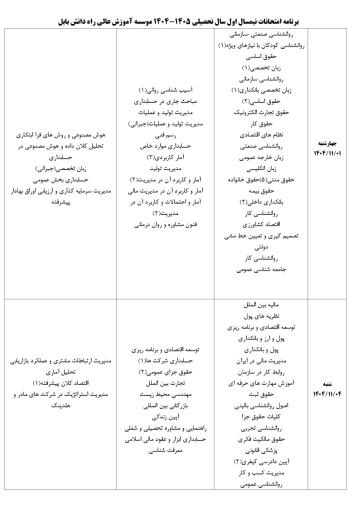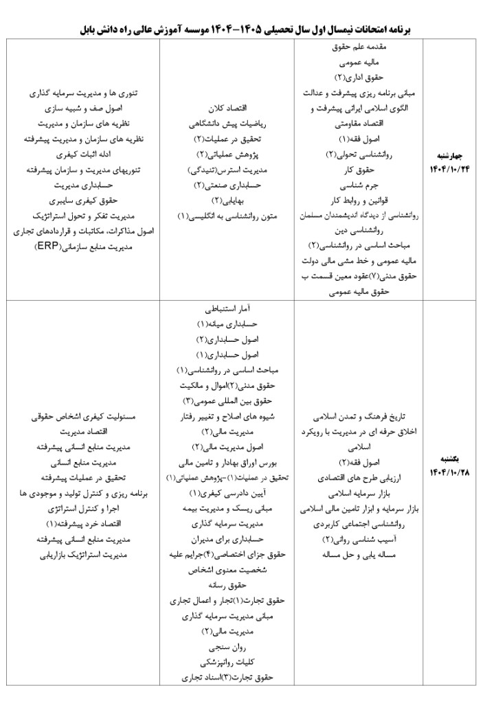 برنامه امتحانات نیمسال اول سال تحصیلی 1404-1405