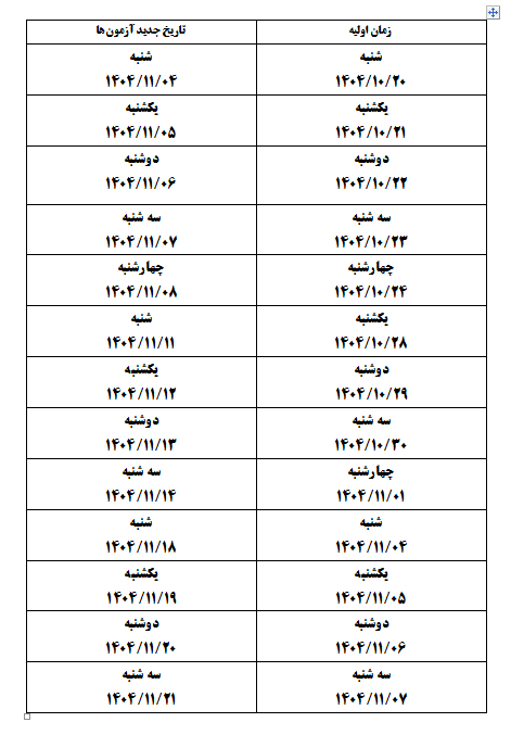 زمان برگزاری آزمونهای پایان ترم از تاریخ 1404/11/4 به شرح ذیل تغییر خواهد