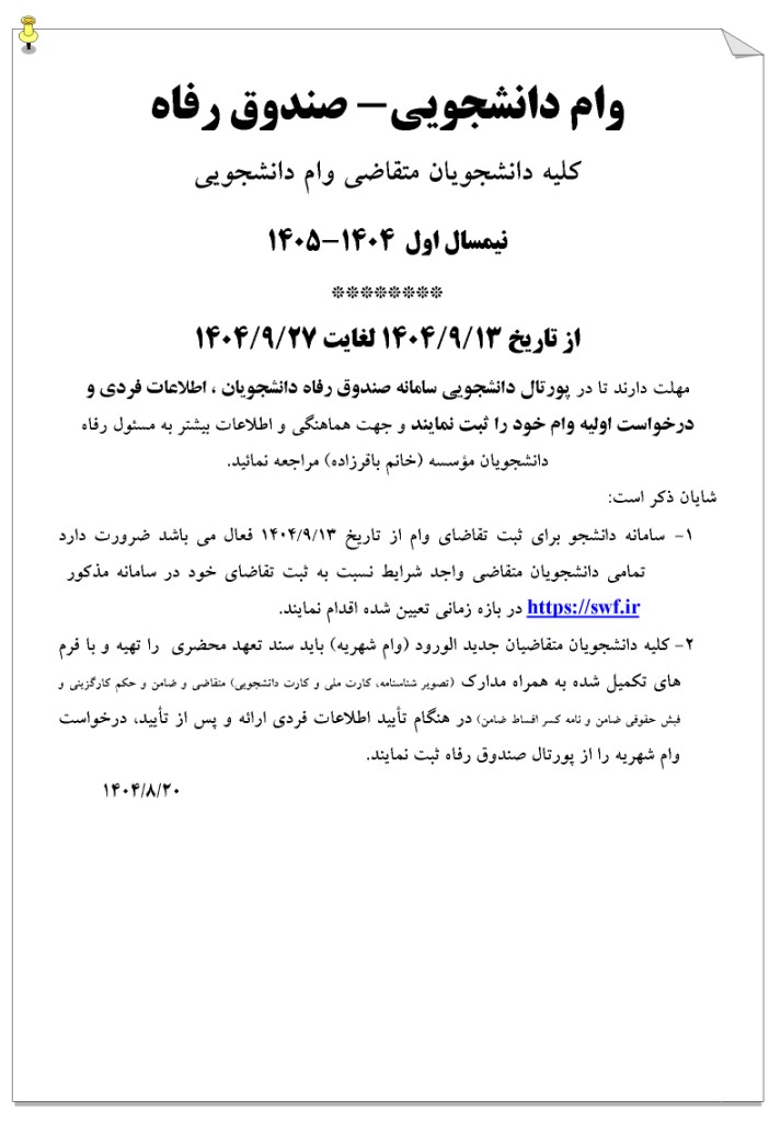 اطلاعیه وام دانشجویی-صندوق رفاه نیمسال دوم 1405-1404